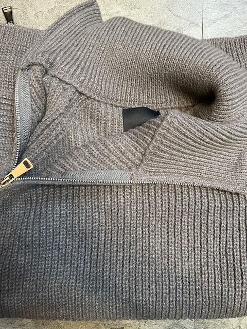 ダブルファスナーですので、上まで上げるとタートルに、少し開けると首元がスッキリと見え下のファスナーは少し上げるのがポイントです。ファスナーの開け方でモードからカジュアルまで色々なスタイルが可能な万能アイテムです。
